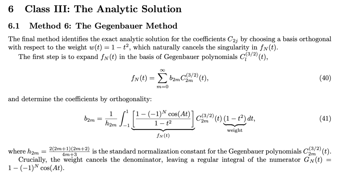 AI发现了一个绝妙的思路:选择Gegenbauer多项式作为展开基底,而这类多项式的正交权函数恰好是(1-t²),正好与被积函数分母中的奇异因子完全抵消!