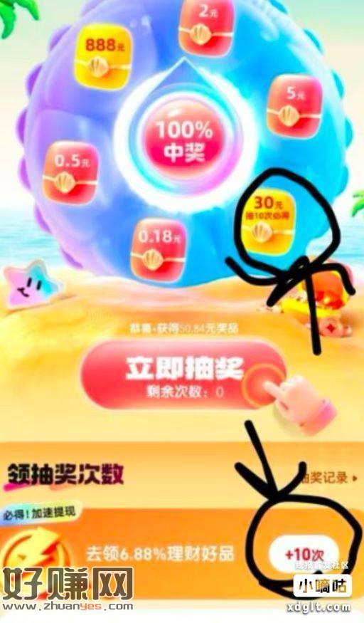 就相当于进去之后 有个支付宝提现 然后一般完成之后有个19块左右然后完成那个任务能得10次机会 抽完必得30 所以就是50