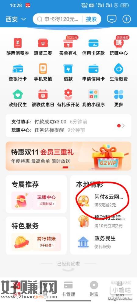 陕西省内用户50毛左右云闪付首页右下本地精彩第一个,进去领5-2通用优惠券,一共可领28个共56毛,被扫可抵扣