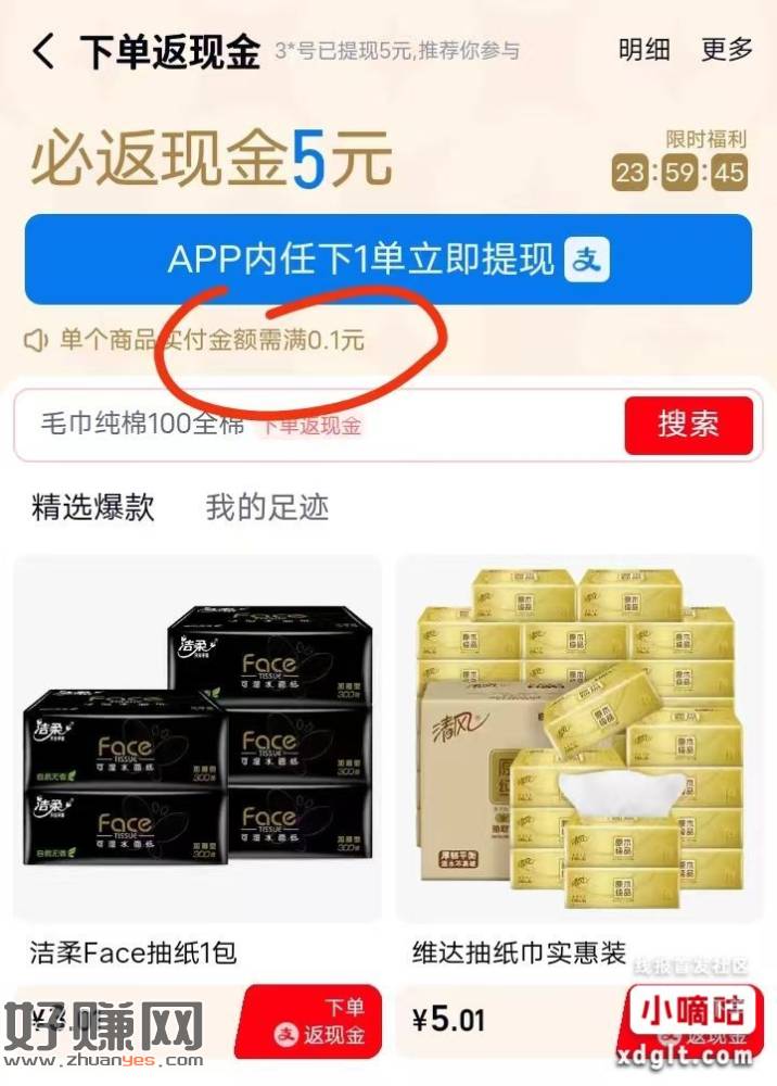 天猫,搜《下单返现》,或者点首页右上角签到进去,下单返现,第一次满0.1返5元,第2次满20返20,不过需要分几天领完,当天提4元