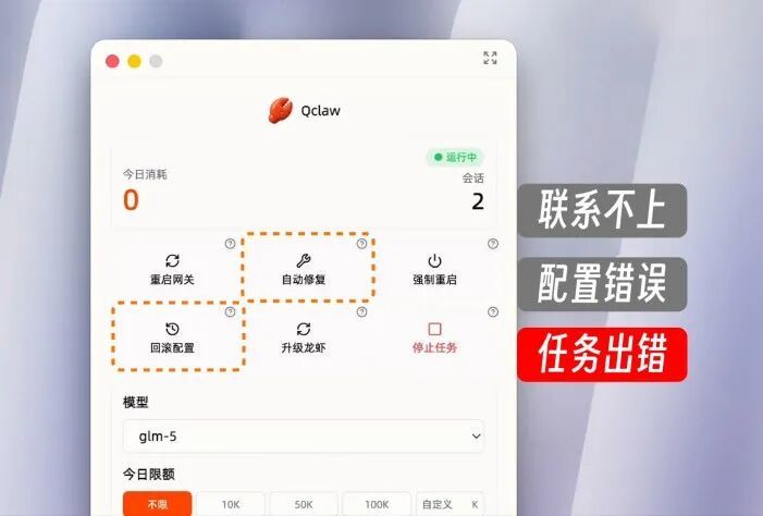 虾联系不上了一键重启网关,配置改坏了一键回滚修复,任务跑偏了直接叫停省token。