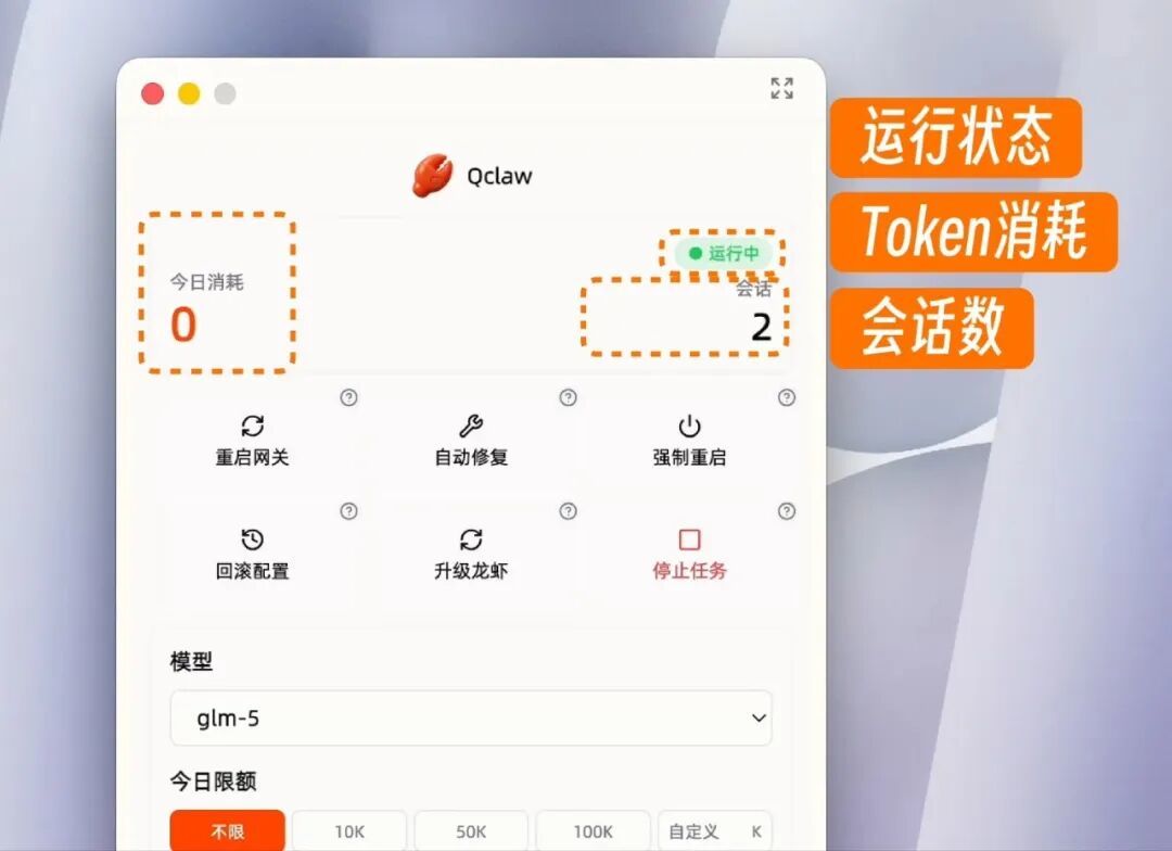 装好之后,日常有个小窗面板,一眼看到虾活没活、今天烧了多少 token、有几条会话;