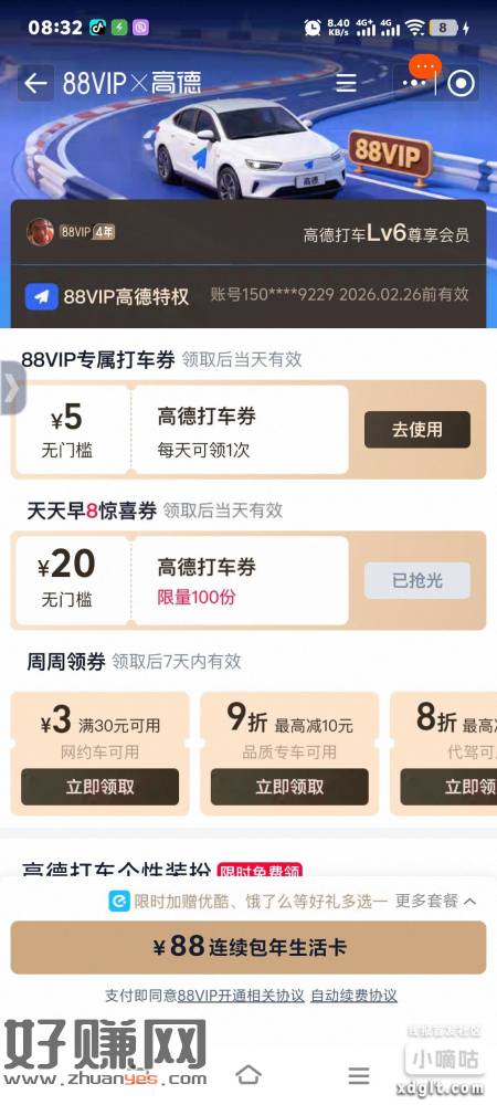 免费领20元无门槛高德打车券。限88vip,每天早8点。