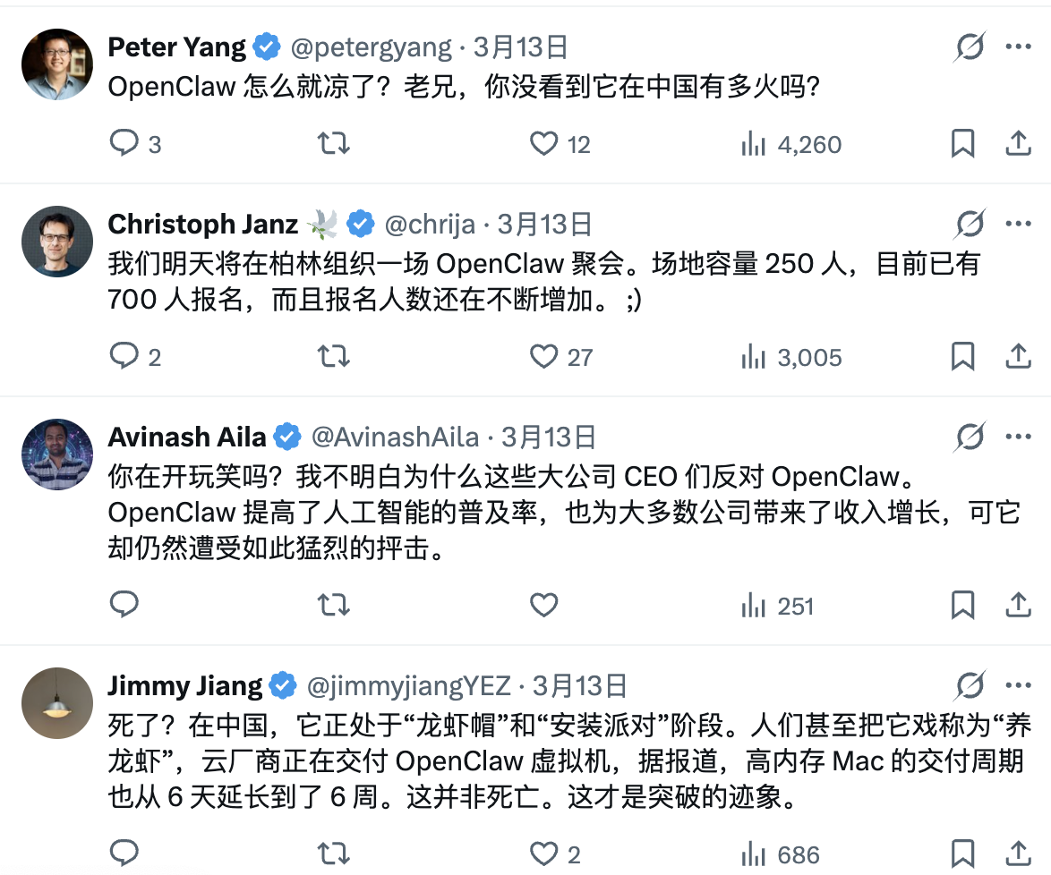 许多网友对他的观点并不买账,有人对此表示:“OpenClaw 怎么就凉了?你没看到它在中国有多火吗?”;另外有人表示:“你在逗我吗?我不明白那些大公司 CEO 们为何反对 OpenClaw。它提高了 AI 普及率,也为大多数公司增加收入,可它却仍然遭受猛烈抨击”。