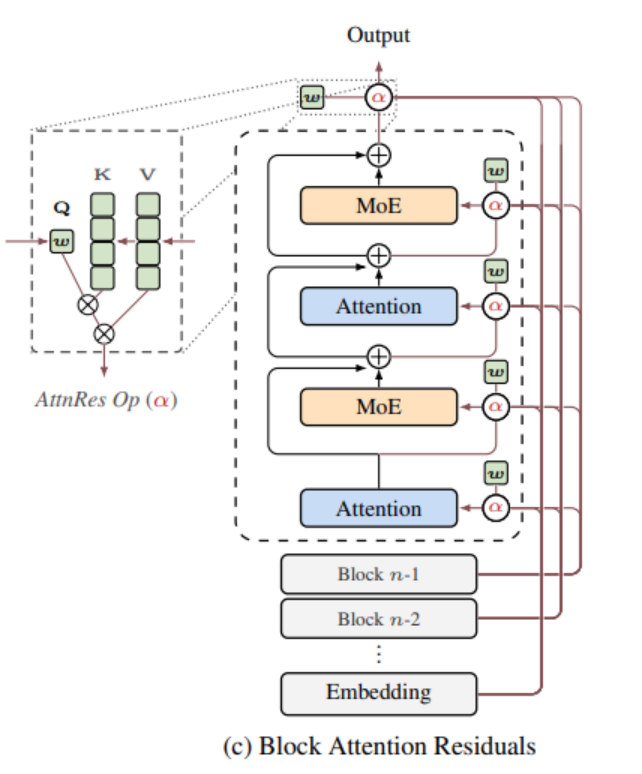 思路是把所有层分成若干个块,每个块内部仍然使用传统的残差连接做求和,但块与块之间使用注意力机制来做选择性聚合。这样需要存储和传输的不再是每一层的输出,而是每个块的汇总表示,内存占用从 O(Ld)降到了 O(Nd),其中 N 是块的数量,通常只有8个左右。