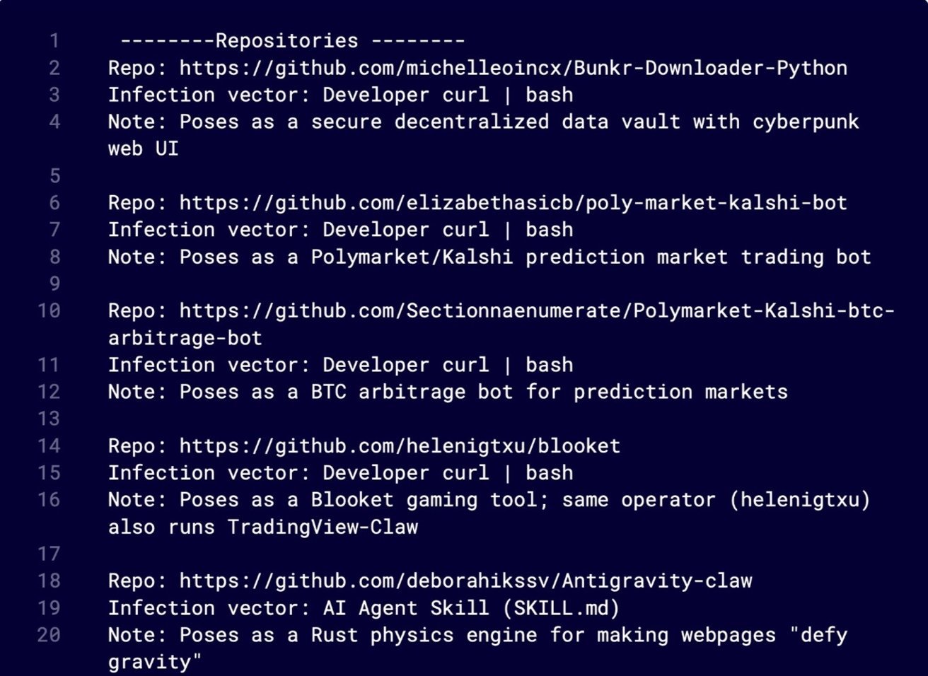 该恶意软件经常潜伏在看似合法的代码库中,例如 SDK、交易工具或开发者实用程序。部分代码库会在较长时间内保持正常,借此建立信誉,随后才引入恶意的安装步骤,导致开发者极难察觉这种转变。