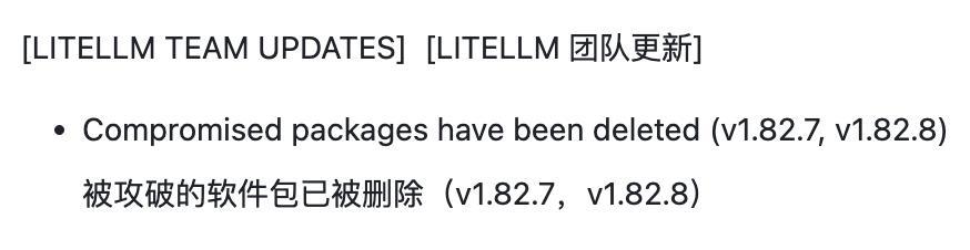 根据最新的进展,此次LiteLLM供应链攻击事件已进入清理与止损阶段。从官方团队发布的更新信息来看,PyPI仓库中被黑客植入恶意代码的污染版本v1.82.7和v1.82.8已被正式删除。