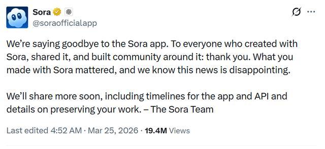 凌晨的时候Sora官方发了一条告别声明,“我们要和Sora App说再见了。”