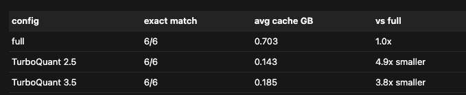 Apple Silicon MLX 框架的知名开发者 @Prince_Canuma 把算法移植到了 Apple Silicon 的 MLX 框架,测试 Qwen3.5-35B 模型,上下文长度从 8500 到 64000 token 全覆盖,每个量化等级都跑出了 100% 的精确匹配。他还发现,2.5 位的 TurboQuant 能把 KV Cache 压缩近 5 倍,准确率零损失。