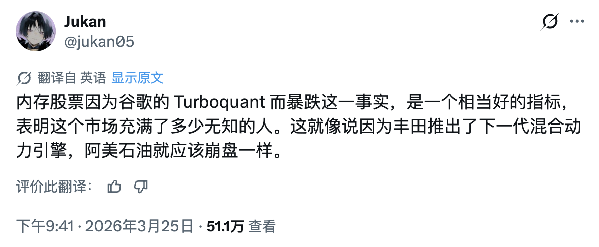 在他看来,如果存储股因为一篇算法论文而大跌,恰恰暴露了市场里有多少人根本没搞清楚这件事的边界,并把这波反应比作「丰田出了新混动引擎,石油就该崩盘」。