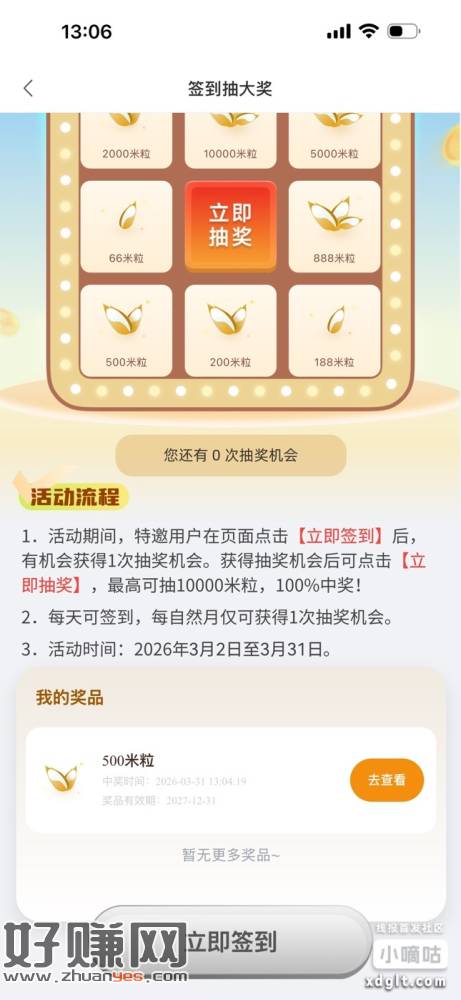 中关村YH5立减金 首页菜单活动拉到底签到一下抽奖中了500米粒兑换5立减金。
