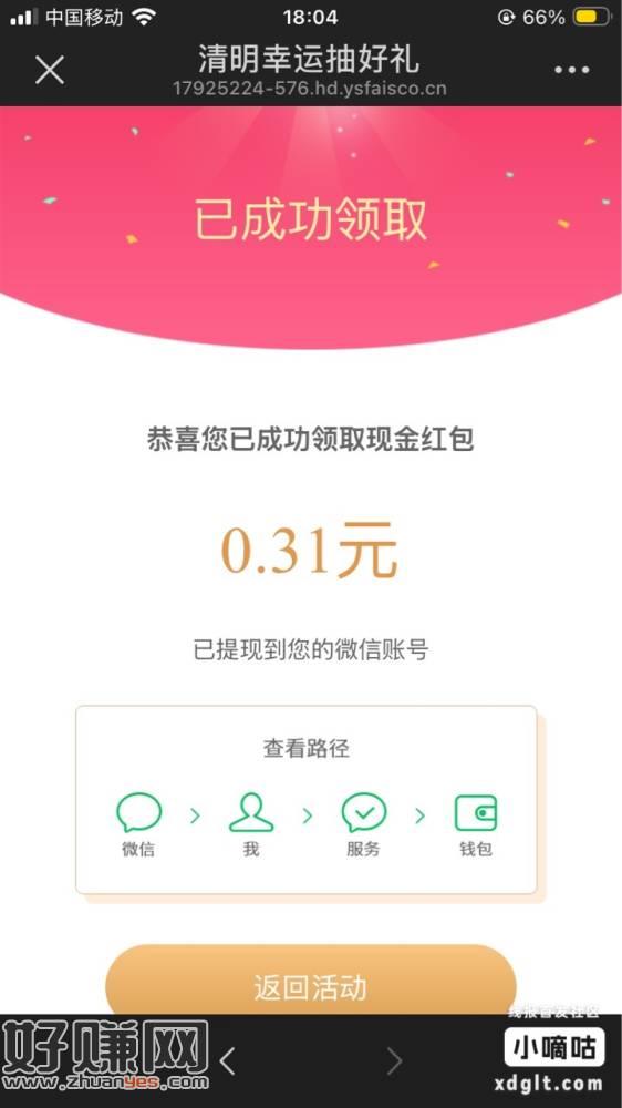微信公众号抽奖(可能要先关注公众号,以防收不到抽奖奖励),我中了四份0.31元。https://mp.weixin.qq.com/s/lzFWPqoYRJRbEh-2ikueSQ