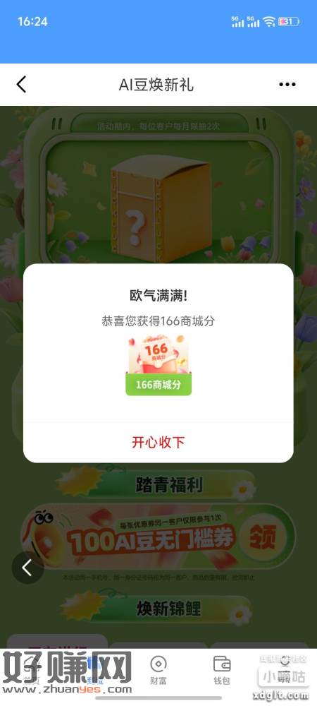 和包app 底部-商城 横幅第二个 有水2次机会 积分能兑换实物大水