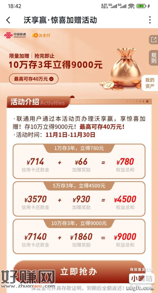联通号码、沃钱包APP、沃享赢存款保证金活动!目前活动期间,可以做到百分之3个点3年按照10万的比例,3年期得利到手9K-实际支出9.1万!按照他这个页面写的支持开具存款证明,到期全额返还!存款证明拿银行去操作2.3年利率的贷款,应该有点利润哦,有现金当我没说,银行3年存款。好像大额才1.5、有资源人脉的搞起来,【妈阁是座城】就让O去飞吧活动链接:https://epay.10010.com/ci-mcss-p ... WFBTHDYFX&test=true