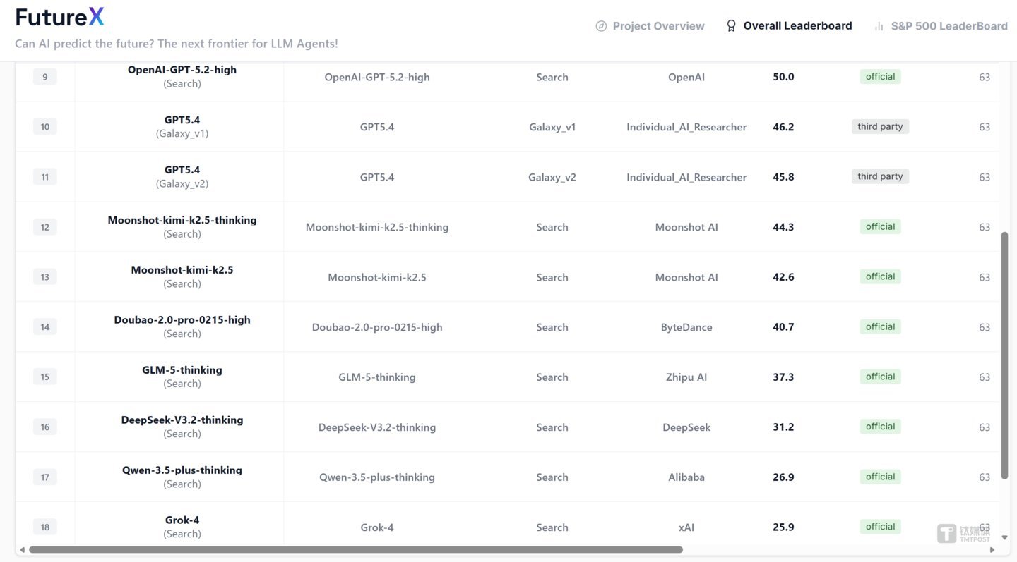 智谱的GLM-5-thinking则拿到37.3分,深度求索的DeepSeek-V3.2-thinking拿下31.2分。阿里的千问Qwen-3.5-plus-thinking则拿到26.9分,位列第17。