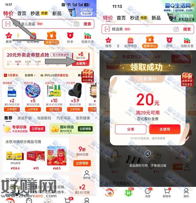 1.京东app-首页顶部【特价】-领券中心-外卖百亿补贴-立即抽奖试试