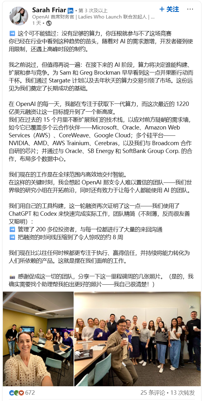 在公司刚拿下1220亿美元融资承诺后,Friar在LinkedIn晒出团队合照,配文表示感谢奥特曼和Greg Brockman「早看清局势、果断拍板」。