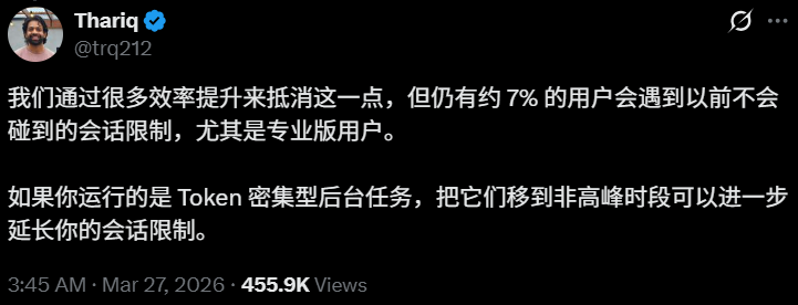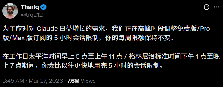 3月下旬,Anthropic被迫宣布,工作日高峰时段Claude用户的5小时会话额度会加速消耗,也就是说,他们开始限流了。