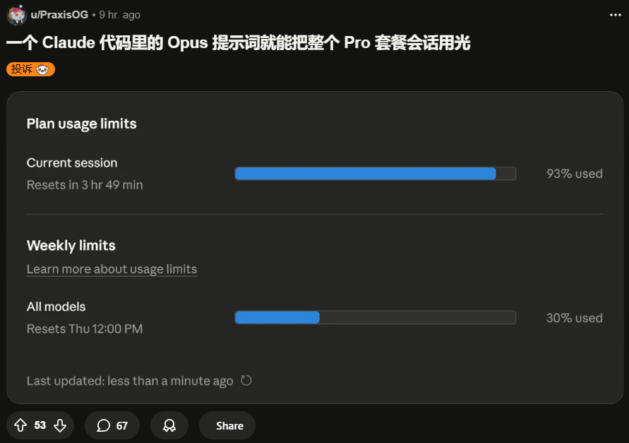 一个月付100美元Max x5套餐的用户表示,以前能用8小时的额度,现在1小时就烧完了。还有人才19分钟就把5小时的额度耗尽。