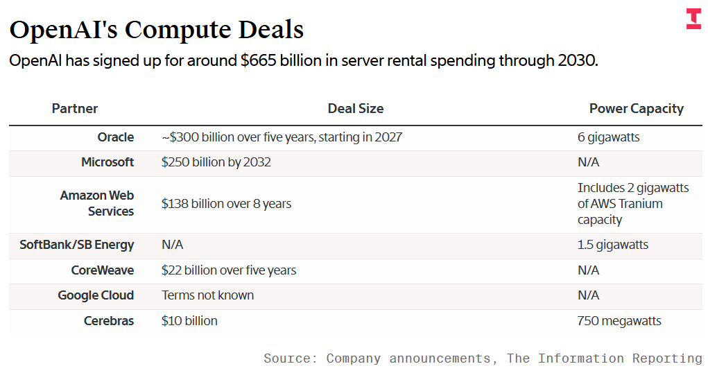 现在,奥特曼已经签下了总计约6650亿美元的算力租赁合同,覆盖到2030年。光Oracle一家就是3000亿美元,微软2500亿美元,AWS 1380亿美元。