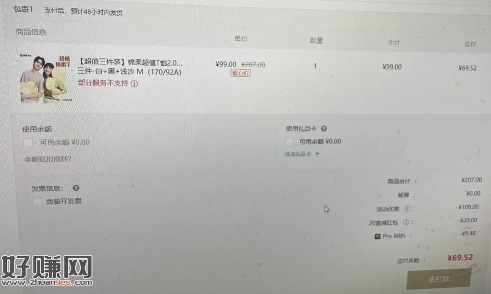领惊喜红包有99-15/20元,然后买网易严选的3件99元的T恤正好用,如果是Pro会员还有88折 这个衣服之前买过,非常厚实