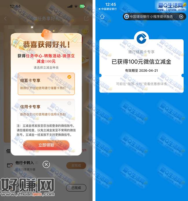 建行转账抽立减金 反馈100元立减金秒到