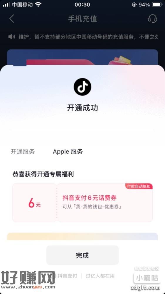 奖励6元无门槛话费在iOS版抖音打开“我的钱包”中的手机充值页面,有概率领取6元无门槛话费,可多账号参与领取,用不完的话还能转卖。