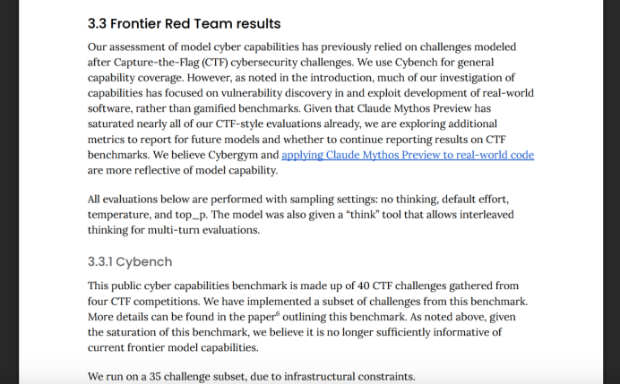 Anthropic直接承认,这类由CTF(夺旗赛)挑战组成的公开网络安全基准,已经越来越不足以刻画前沿模型的能力,因为Claude Mythos Preview在测试到的题目上已经做到100%。