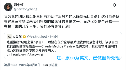 在这次Claude Mythos与“玻璃之翼项目(Project Glasswing)”的公布中,Cheng也屡次出现在官方信息和媒体采访中。