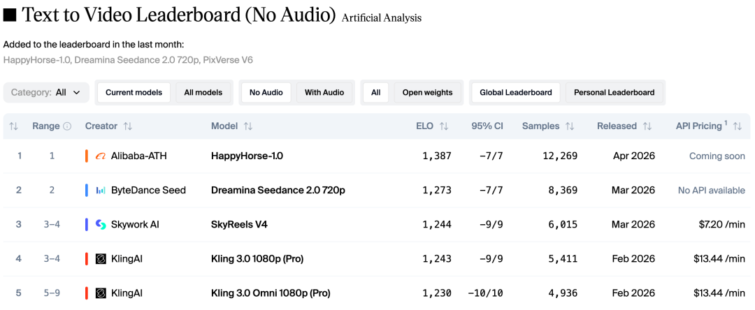 本周三,HappyHorse-1.0 视频生成模型突然出现在 AI 评测平台 Artificial Analysis 的视频竞技场榜单上,以压倒性的表现登顶文生视频、图生视频等多个赛道,直接超越前段时间大火的 Seedance 2.0。