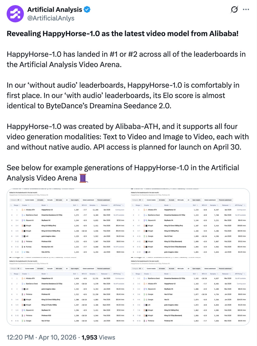 AI 评测平台 Artificial Analysis 也在阿里确认这一消息后,在 X 平台迅速发文,表示 HappyHorse-1.0 目前已经在视频竞技场的所有排行榜上都取得了第 1 或第 2 名的好成绩。