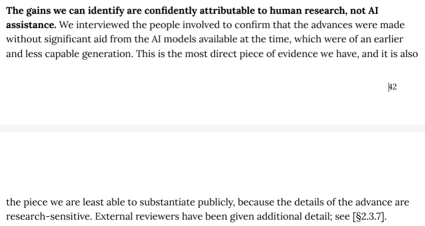 另外,Anthropic在Mythos上的进展源于人类研究,并未得到AI模型的显著帮助。目前尚未出现显著的递归式自我改进(Recursive Self Improvement)。