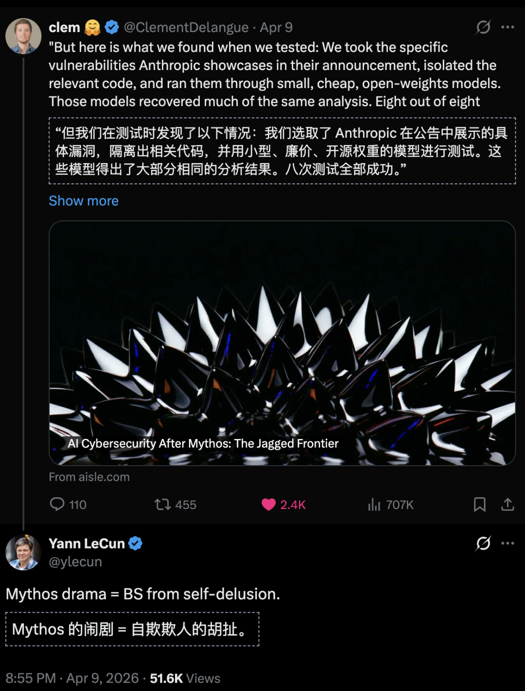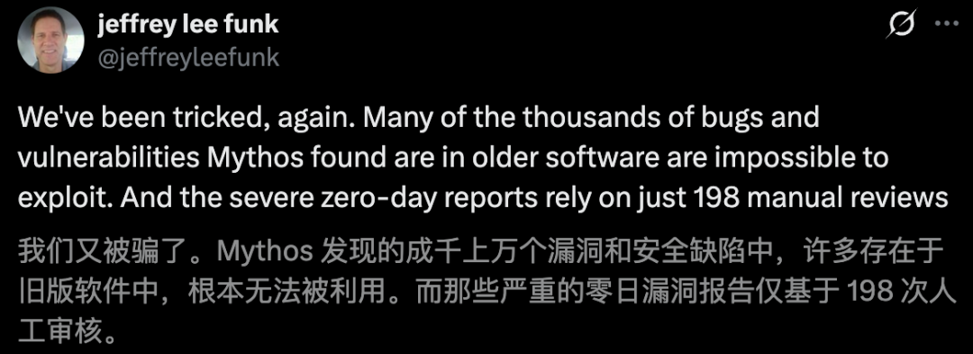 然而,AISLE创始人Stanislav Fort一份最新硬核测试报告,直接撕开了这层华丽的外衣。
