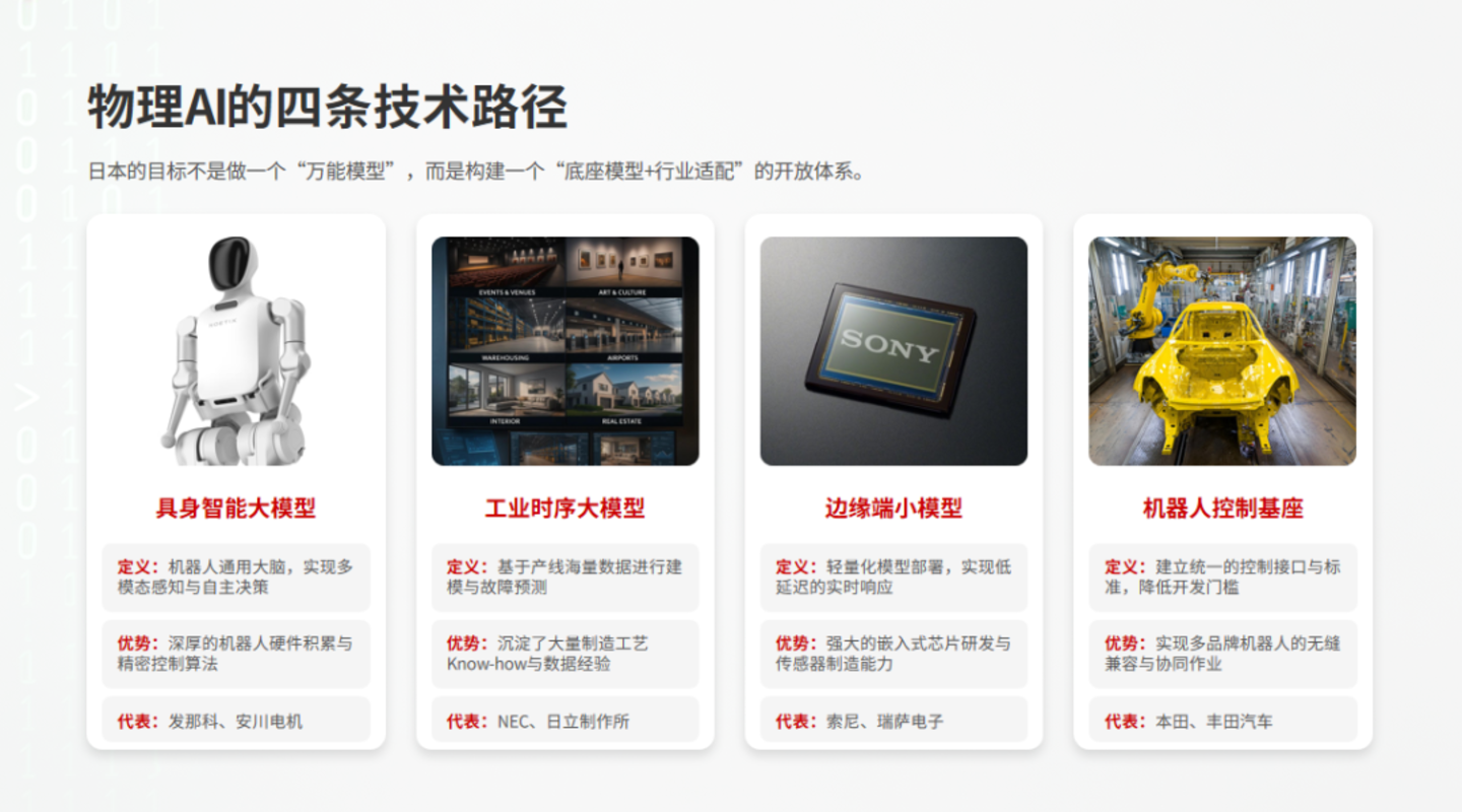 物理AI至少包含四条技术路径:具身智能大模型(机器人通用大脑)、工业时序大模型(产线数据建模预测)、边缘端小模型(实时响应低延迟)、机器人控制基座(统一控制接口)。日本的目标不是做一个万能模型,而是构建一个“底座模型+行业适配”的开放体系。这比通用大模型更复杂,但也更贴近日本的实际需求。