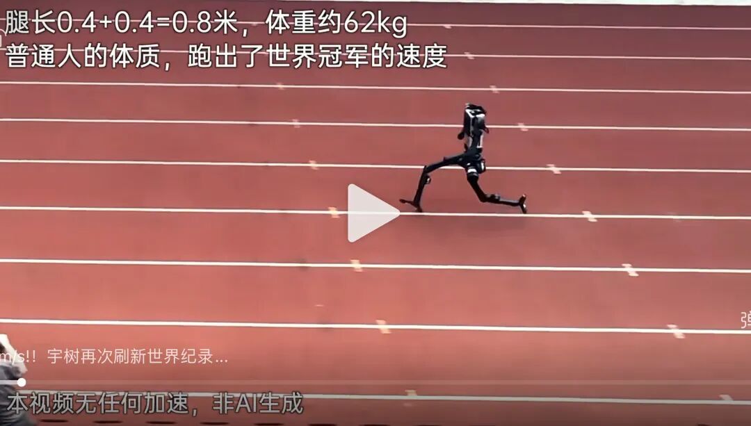 在此前官方参数介绍中,H1机器人身高约180厘米、体重约47kg,在2025年8月以3.3米/秒的速度创下人形机器人速度纪录。这一次视频中奔跑的机器人则进行了适赛化改造,去掉了头部、手部,腿长为“0.4+0.4=0.8米”。