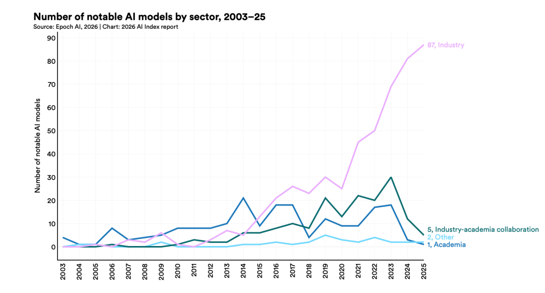 去年发布的95个最具代表性的模型里,超过九成都来自产业界,不是学术机构,也不是政府实验室。