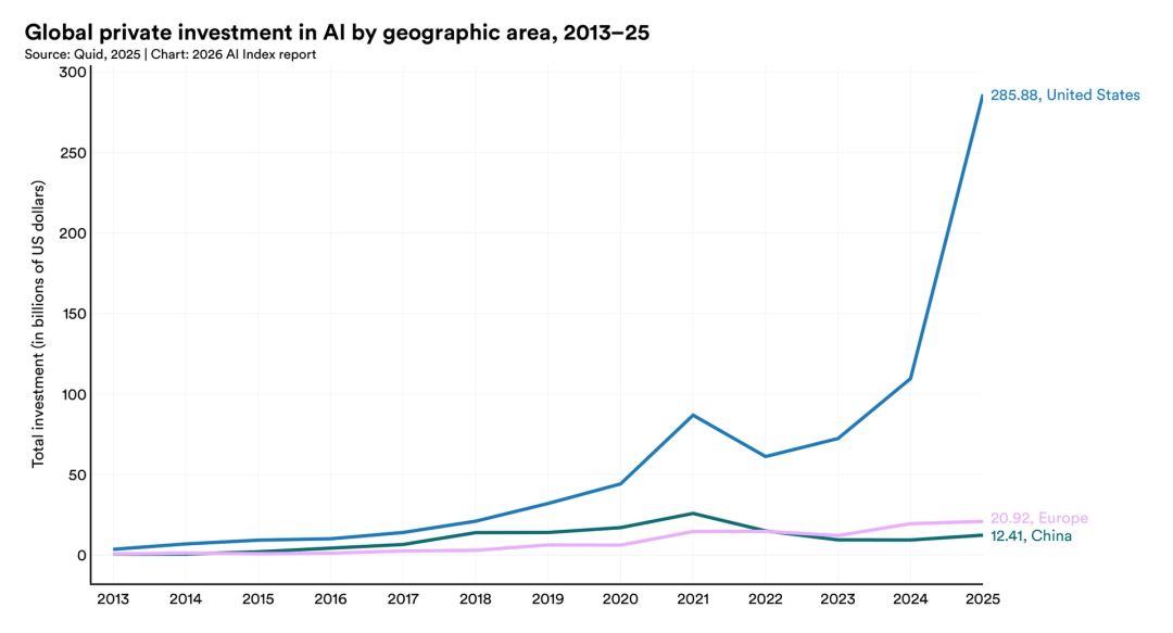 国别上,美国一骑绝尘。2025年美国私募AI投资2859亿美元。并且一年新增1953家AI创业公司,也是排名第二的10倍以上。