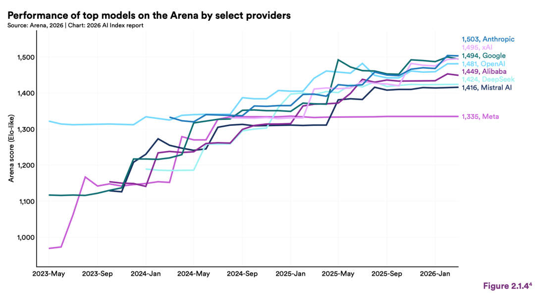 中美AI模型性能差距已基本消失,双方在巅峰对决中频繁易主,目前Anthropic领先优势仅剩2.7%。