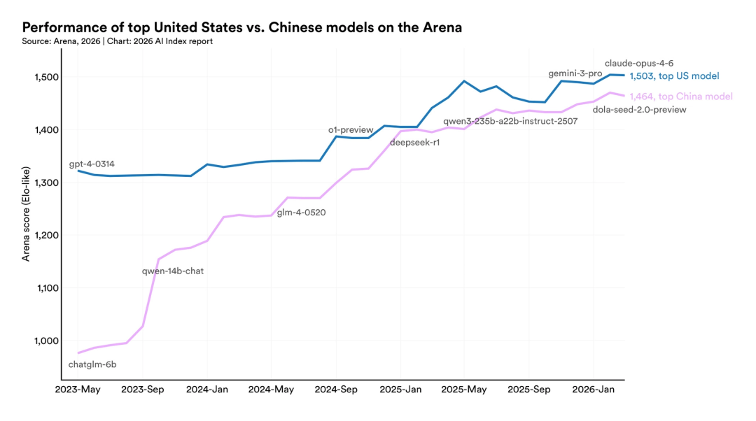 2026年3月,美国的Claude Opus 4.6拿到1503分,中国dola-seed-2.0-preview拿到1464分。