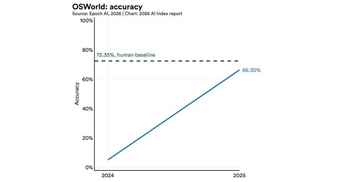 另外,在智能体任务中,OSWorld测试中,前沿AI实力(66.3%)正逼近人类基线。