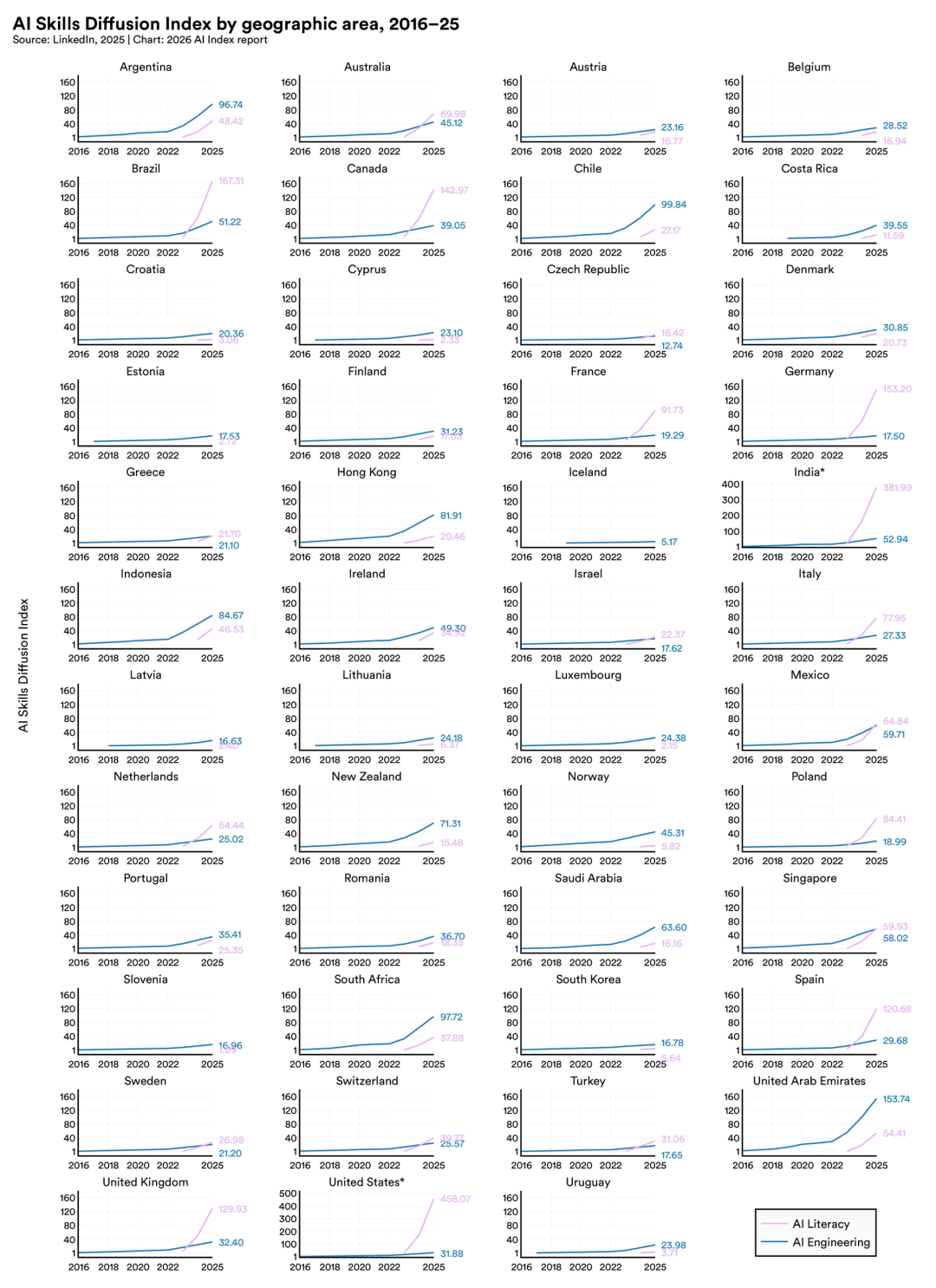 正规教育跟不上的同时,自学浪潮在全球开炸。里面写,学AI工程技能增长最快的三个国家分别是阿联酋、智利和南非。