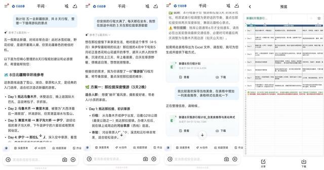 千问还能深度理解多轮对话上下文,在旅行规划、项目讨论、学习复盘等场景,用户与千问反复沟通细节后,只需一句“把刚才聊的内容整理成Excel行程计划”,千问便能自动提炼关键信息,生成包含日期、地点、交通、住宿、预算、备注等完整字段的结构化表格,一键保存、随时分享。