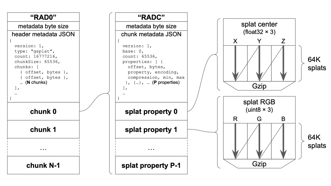 为了鱼和熊掌兼得,Spark 2.0 设计了新格式 .RAD(RADiance fields)。它把 splat 数据切成每块 64K 个 splat 的独立小块,分别压缩,并在文件头中记录所有块的字节偏移位置,支持随机访问任意一块。