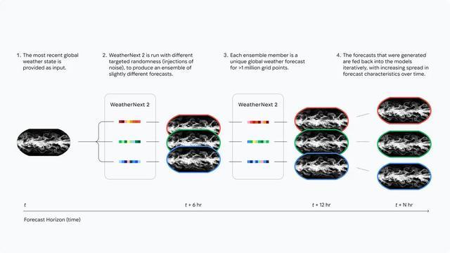 据谷歌官方介绍,WeatherNext 2 的运算速度较前代提升约 8 倍,并可生成分辨率精细到 1 小时级别的预测结果。其主要突破来自能够提供数百种可能情境的新模型架构,过去团队也已利用此类技术在实验性气旋预测中协助气象机构进行多情境分析。