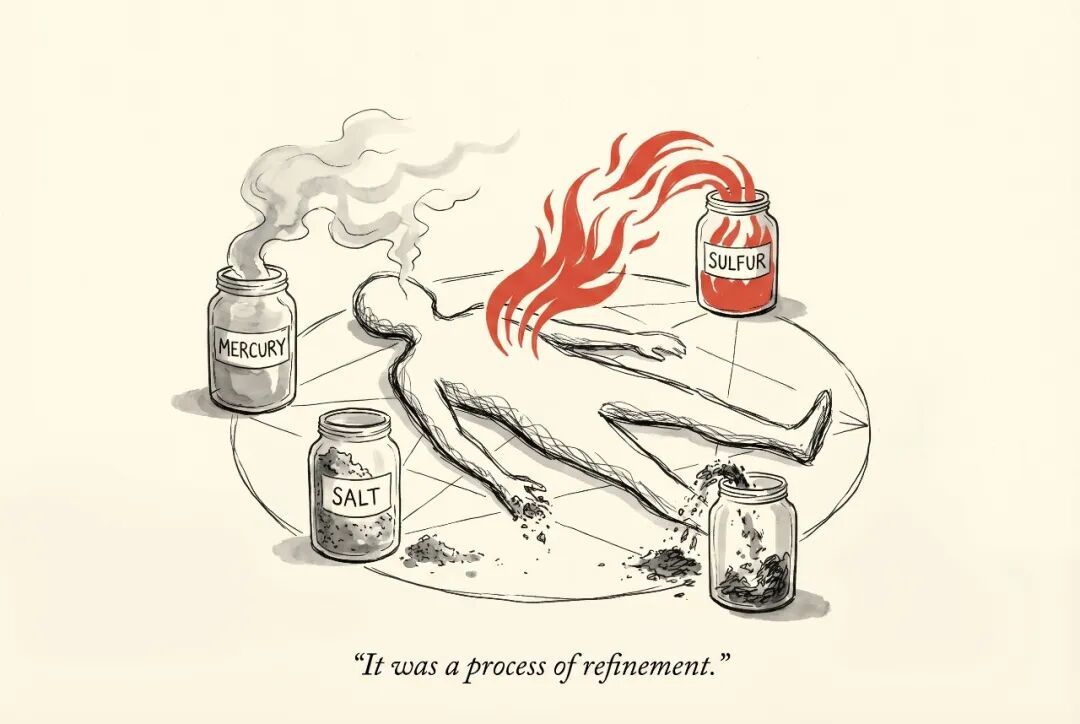 盐是肉体。汞是精神——包括你的想象力、判断力、一切高等心智功能。硫是灵魂——你的情感、欲望、驱动你活下去的那股力量。