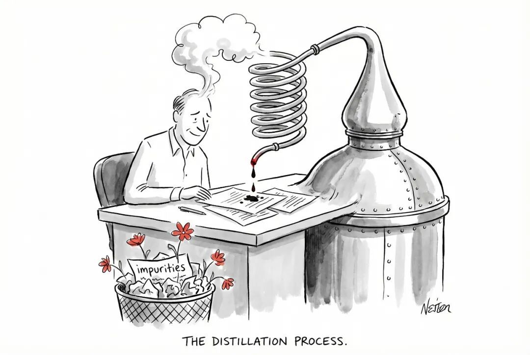 但蒸馏不是,蒸馏的物理过程自带了一整套关于纯与不纯、精华与废料、有价值与无价值的隐喻。你只要用了这个词,这套隐喻就跟着进来。