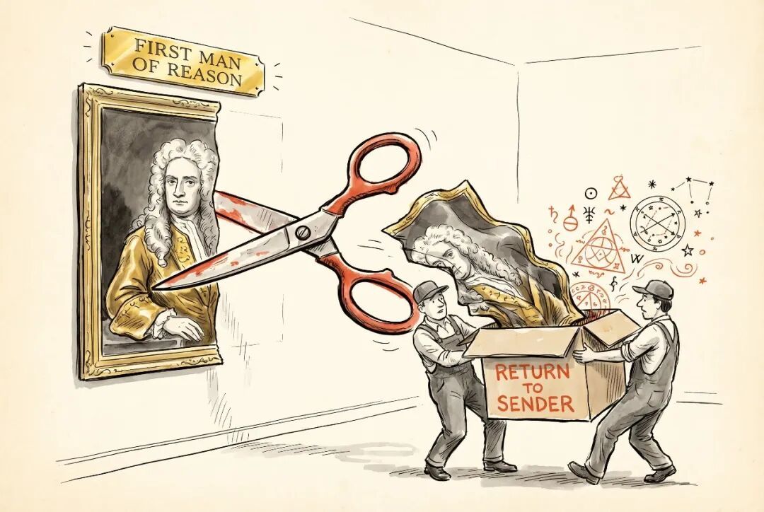于是,同一个人被劈成了两半。符合理性叙事的那一半保留,不符合的那一半装进箱子送回贵族家的阁楼。从此,我们有了教科书里的牛顿:苹果砸脑袋,万有引力,光的色散,微积分。干净利落,一个纯粹的理性巨人,「理性时代的第一人」。
