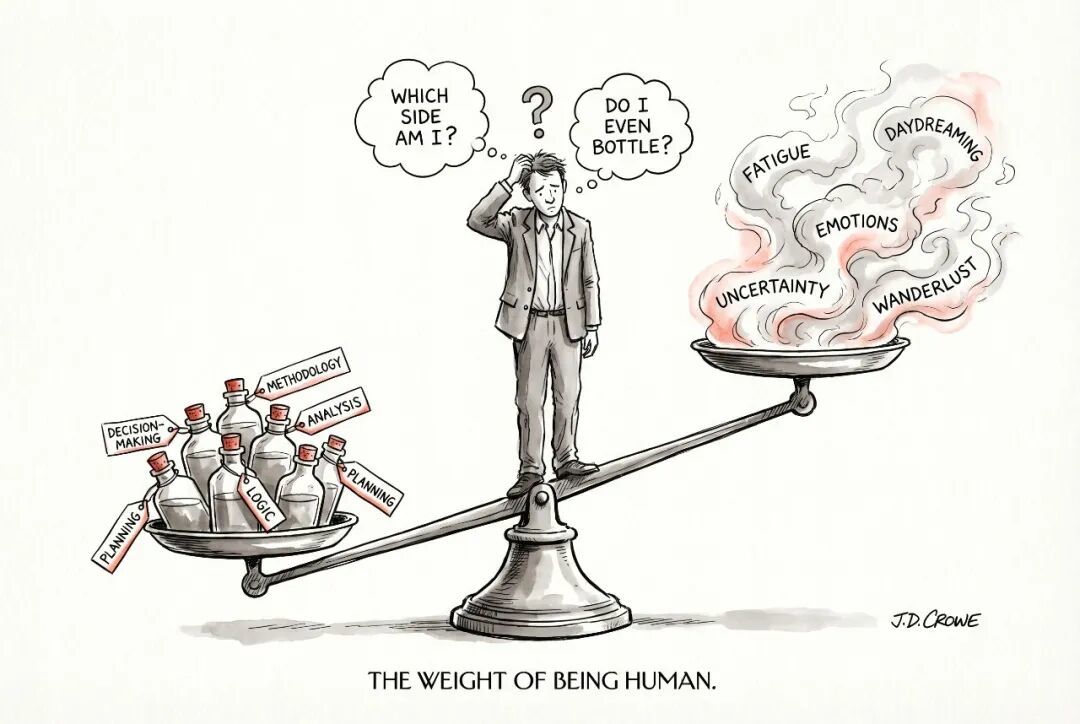 第二是分离。蒸馏的目的是把「有价值的部分」和「没价值的部分」分开。这里面藏着一个判断:你这个人是一种混合物,其中只有一部分是被需要的,比如你的决策模式、你的工作方法、你的判断习惯——这些是馏出物,要被收集。其他的,你的疲惫、你的情绪波动、你每天午饭后犯的困、你对工作意义的追问、你在做判断之前盯着窗外发呆的那三分钟——这些是杂质。这个词在使用的瞬间,就已经把你拆件估值了。
