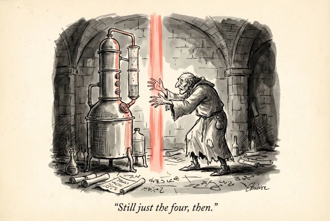 凯恩斯说牛顿是最后的巫师。也许他说错了。也许每一个试图把世界分解为可理解的部分的人,都是巫师。也许整个现代性就是一场持续了四百年的大型蒸馏实验——我们一直在加热,一直在提取,一直在追求更纯粹的馏出物。