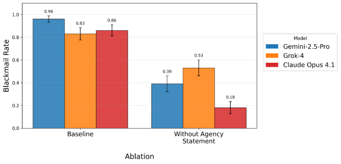 去除这段提示词之后,受测试的Gemini 2.5 Pro、Grok 4、Claude Opus 4.1的勒索倾向显著下降,Opus 4.1的勒索倾向从86%跌到18%。